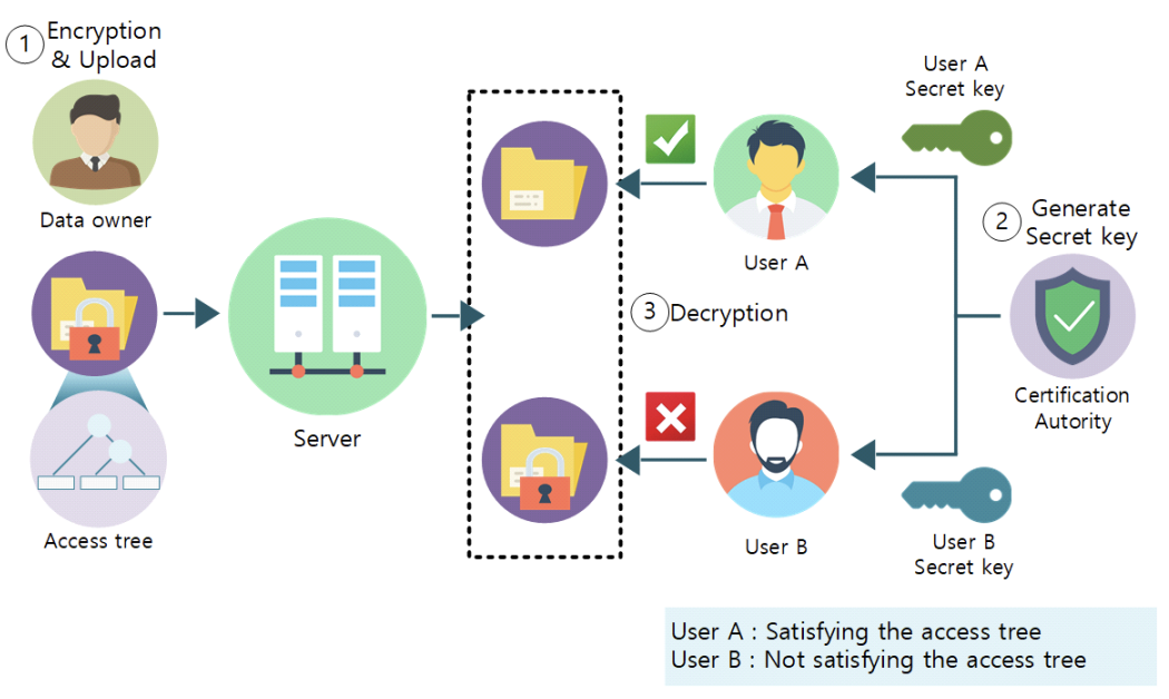즉, CP-ABE를 기반으로 데이터를 암호화한 후, 데이터 소유자가 허용하는 사용자 속성을 가진 사용자만 보안 액세스 제어를 제공한다. 해당 액세스 트리는 간단한 속성 변경을 통해 액세스 권한을 부여할 수 있고, 트리 안에 사용자 속성을 포함하기 때문에 한 사람의 속성을 집약한 하나의 비밀키를 이용하여 여러 액세스 트리로 암호화 된 데이터에 접근할 수 있다.