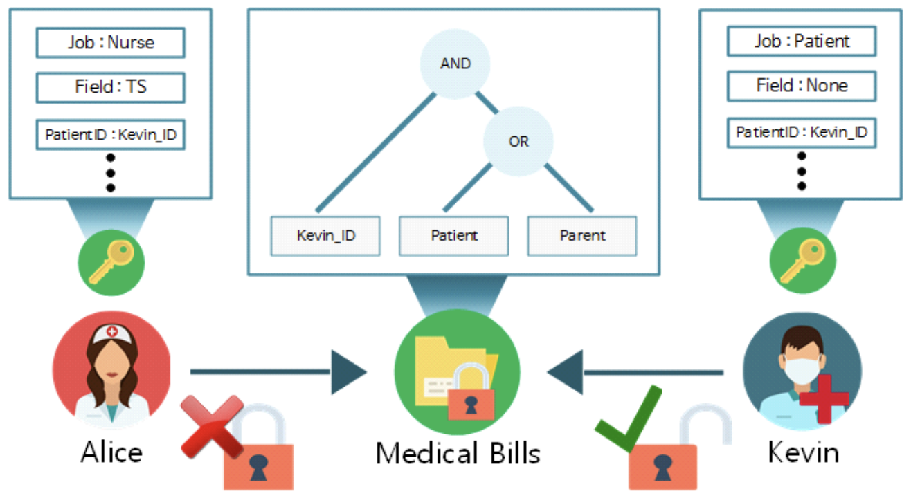 해당 그림은 환자의 privacy를 지키기 위해 medical bill에 접근 가능한 사람을 환자 본인과 보호자로 제한 했을 시, CP-ABE를 사용한 데이터 접근을 나타낸다. 각각이 가지고 있는 속성의 구분은 위 예시에서 job, field, patientID로 구분되어지며, 각 구분 별로 access tree를 만족하는 속성을 가지고 있어야만 데이터 복호화가 가능하다. Alice의 경우 Job: Nurse/Patient ID(담당환자): Kevin_ID/Field: Thoracic Surgery의 속성을 보유하고 있다. 따라서 액세스 트리를 만족하지 못하기 때문에 Alice는 암호화된 medical bill을 복호화 할 수 없다. Kevin의 경우에는 Job: Patient/Patient ID: Kevin_ID/Field: None의 속성을 가지고 있기 때문에 액세스 트리를 만족하여 데이터를 복호화 할 수 있다.