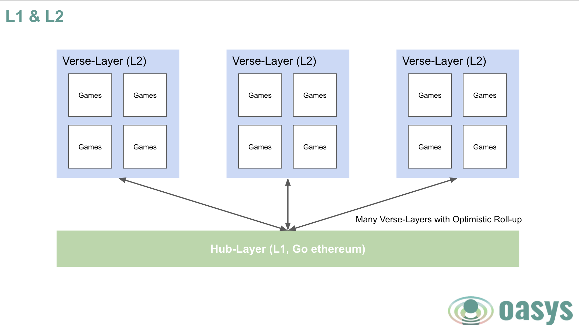 Oasys는 layer 2의 아키텍처를 가지고 있다. Layer 1이자 모든 layer 2의 Hub-layer가 되는 Oasys-Hub와 optimistic rollup을 지원하는 여러개의 Verse-layer로 구성되어 있다. Layer1, 2 모두 ethereum의 fork 버전이며 EVM이 있어서 solidity smart contract가 동작 가능하다.