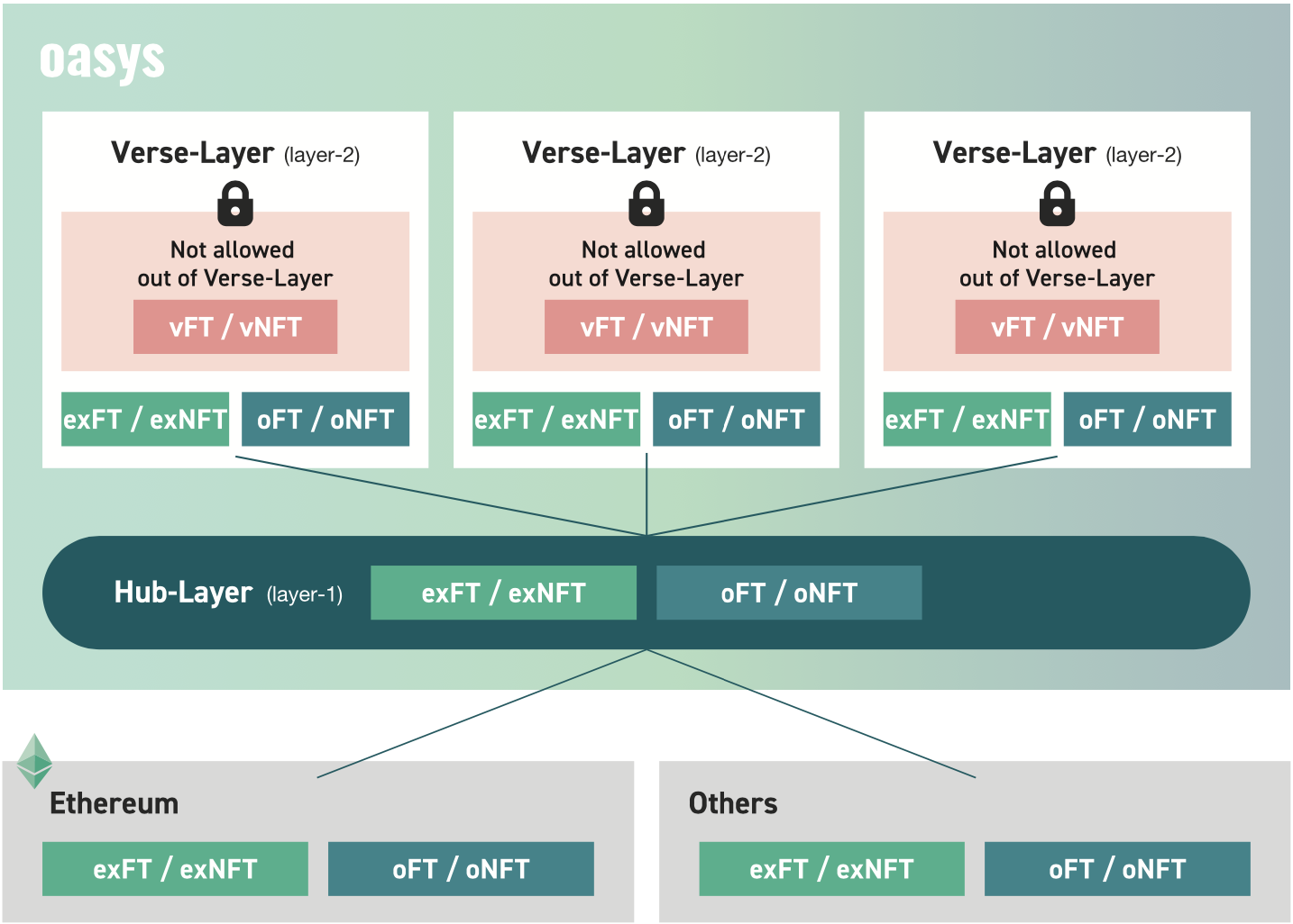exFT와 exNFT는 Oasys 내부가 아닌 다른 외부 네트워크 블록체인으로 부터 전송 받은 토큰이다. Hub layer 뿐만 아니라 각 verse layer에서도 사용 가능하다.
