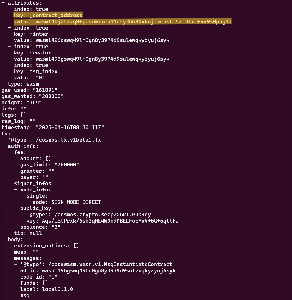 Instantiate 이후 컨트랙트 주소가 생성된다. attribute 내의 _contract_address가 그것이다. (위 그림에서 wasm14hj2tavq8fpesdwxxcu44rty3hh90vhujrvcmstl4zr3txmfvw9s0phg4d이다. 길이가 일반 계정주소와 달리 길어서 쉽게 식별할 수 있다.) Code ID 하나에 instantiate 여러번 수행하여 각각의 컨트랙트 주소를 생성할 수 있다. 이 컨트랙트 주소를 통해 실행시킬 수 있다.