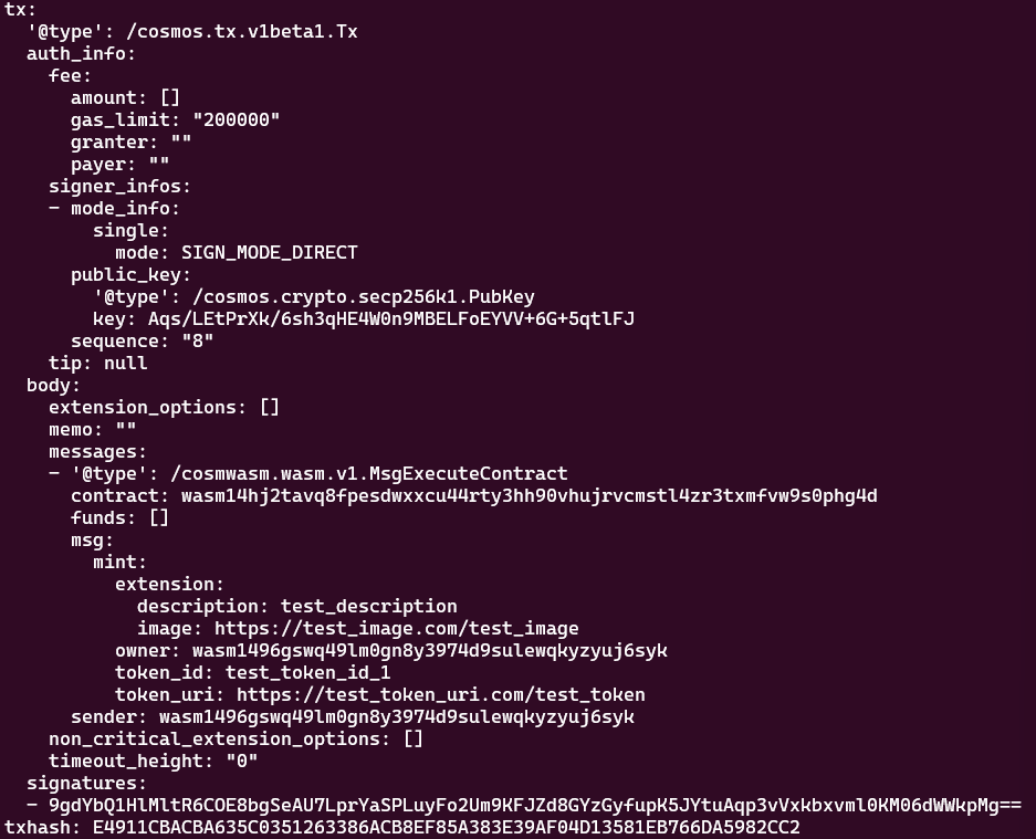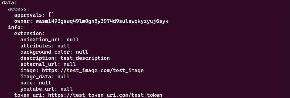 $ wasmd query wasm contract-state smart wasm14hj2tavq8fpesdwxxcu44rty3hh90vhujrvcmstl4zr3txmfvw9s0phg4d '{"all_nft_info":{"token_id":"test_token_id_1"}}'