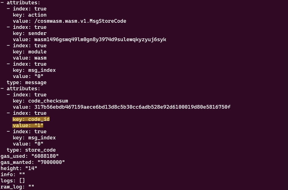 사용된 가스는 6088180이다. 여기서 확인해야 할 사항은 attribute 내의 code_id값이다. code_id는 등록된 wasm 파일 별로 시퀀셜하게 증가하는 값으로, 이 값을 통해 instantiate를 수행하기 때문에 자신이 등록한 wasm 파일의 code_id를 기억해야 한다.